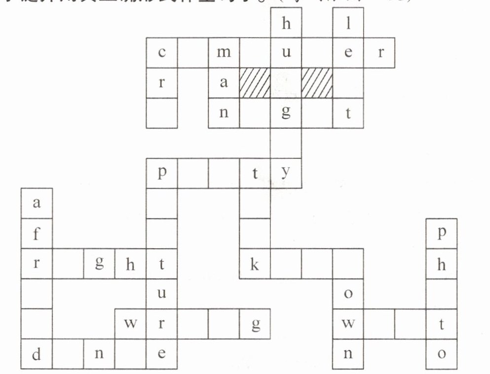 【解析】:这是一道英语字谜填空题,考查学生对单词的拼写以及对句子语境的理解能力。解题的关键在于根据句子所提供的语境和首字母提示,结合字谜中给出的字母,拼写出合适的单词。