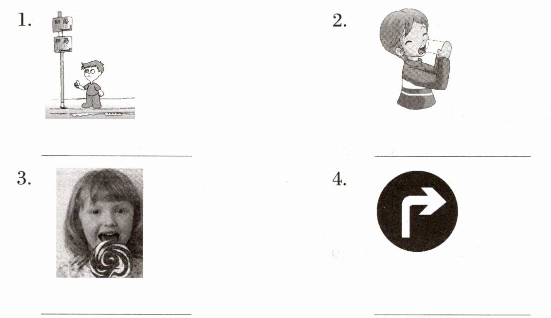 1. wait for a bus 2. drink water 3. eat candy 4. turn right