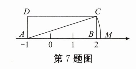 7. 如图,在长方形$ABCD$中,$AB = 3$,$AD = 1$,$AB$在数轴上。若以点$A$为圆心,对角线$AC的长为半径作弧交数轴的正半轴于M$,则点$M$表示的数为()