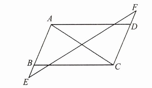 8. 如图,在$□ ABCD$中,延长$AB到点E$,延长$CD到点F$,使$BE= DF$,连接$AC$,$EF$. 求证:$AC与EF$互相平分.
