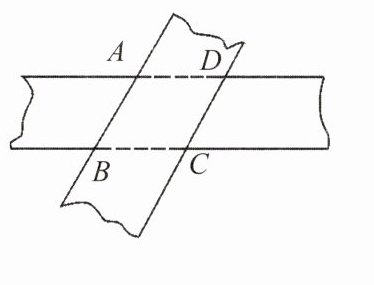 因为彩带宽度相同,所以$AB// CD$,$AD// BC$,所以四边形$ABCD$是平行四边形。
