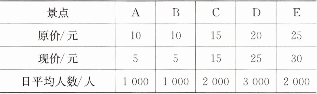 (1)风景区计算调整前的平均价格:$(10 + 10 + 15 + 20 + 25)÷5 = 16$(元),调整后的平均价格:$(5 + 5 + 15 + 25 + 30)÷5 = 16$(元)。因为平均价格不变,且日平均人数不变,所以认为日平均总收入持平(日平均总收入$=$平均价格$×$日平均总人数)。