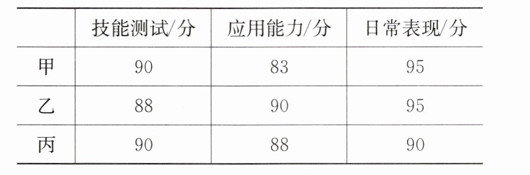 丙的技能测试成绩为$90$分,应用能力成绩为$92$分,日常表现成绩为$85$分。