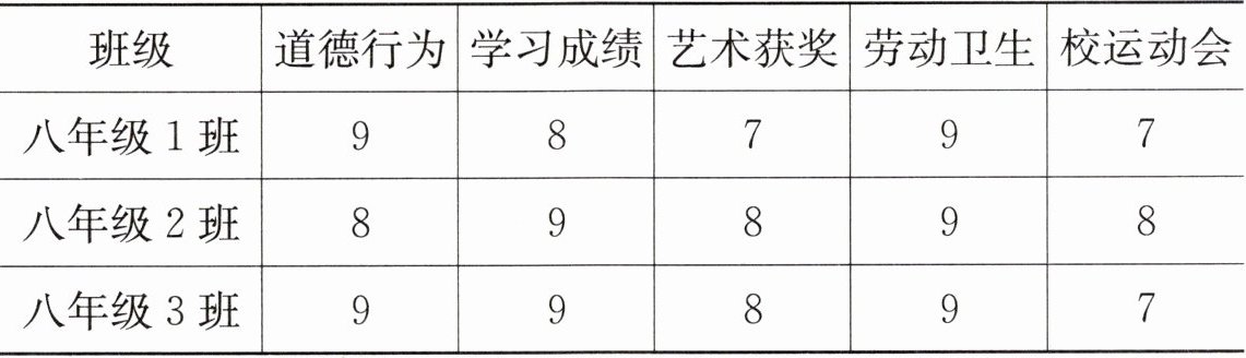 11. 某校决定从八年级三个班中选择一个班作为市级先进班级的候选班,现对这三个班进行综合素质考评,下表是这三个班五项考评的得分表(单位:分,每项满分为 $ 10 $ 分).