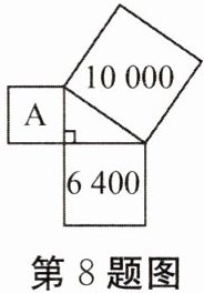 8. 如图,图中的三角形是直角三角形,四边形都是正方形,其中两个正方形的面积分别为6400,10000,则正方形A的面积是 ()