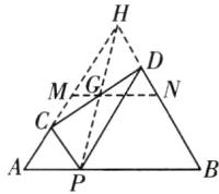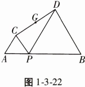 22. 如图1-3-22,已知AB= 10,P是线段AB上的动点,分别以AP,PB为边在线段AB的同侧作等边三角形ACP和等边三角形PDB,连接CD,设CD的中点为G,当点P从点A运动到点B时,求点G移动路径的长。