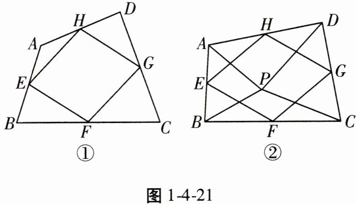 (1)如图1-4-21①,在四边形ABCD中,点E,F,G,H分别为边AB,BC,CD,DA的中点。求证:中点四边形EFGH是平行四边形;