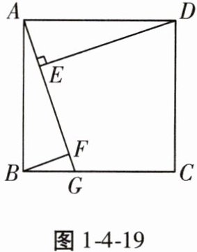 18. 如图1-4-19,在正方形ABCD中,G是BC上任意一点,连接AG,DE⊥AG,垂足为E,BF//DE交AG于F,探究线段AF,BF,EF三者之间的数量关系,并说明理由。