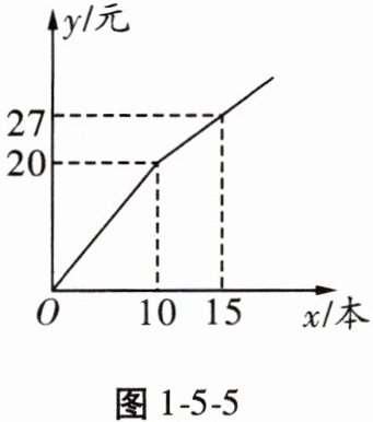 15. 小明到超市买练习本,超市正在打折促销:购买$10$本以上,从第$11$本开始按标价打折优惠,买练习本所花费的钱数$y$(元)与练习本的本数$x$之间的关系如图1-5-5所示,那么在这个超市买$10$本以上的练习本的优惠折扣是____折。