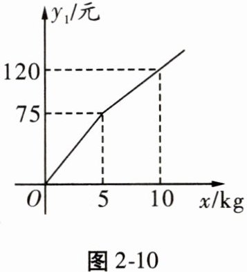 21. (8分)因活动需要购买某种水果,数学活动小组的同学通过市场调查得知:在甲商店购买该水果的费用$y_{1}$(元)与该水果的质量x(kg)之间的关系如图2-10所示;在乙商店购买该水果的费用$y_{2}$(元)与该水果的质量x(kg)之间的函数解析式为$y_{2}= 10x(x≥0)$。
