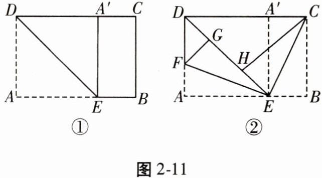 23. (10分)如图2-11,将矩形ABCD沿DE折叠,使顶点A落在DC上的点A'处,然后将矩形展平,沿EF折叠,使顶点A落在折痕DE上的点G处,再将矩形ABCD沿CE折叠,此时顶点B恰好落在DE上的点H处。