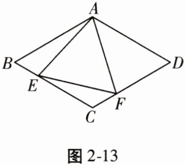 25. (10分)如图2-13,在菱形ABCD中,AB= 4,∠BAD= 120°,△AEF为等边三角形,点E,F分别在菱形的边BC,CD上滑动,且E,F不与B,C,D重合。