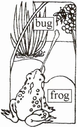 The frog stays very still. It stares straight ahead(直视前方). The frog waits and waits. It waits for something to move. Soon a bug flies by. The frog shoots out its tongue(吐出舌头). The frog's tongue is very long and sticky(有黏性的). The frog catches the bug on its tongue. The bug can't get away.