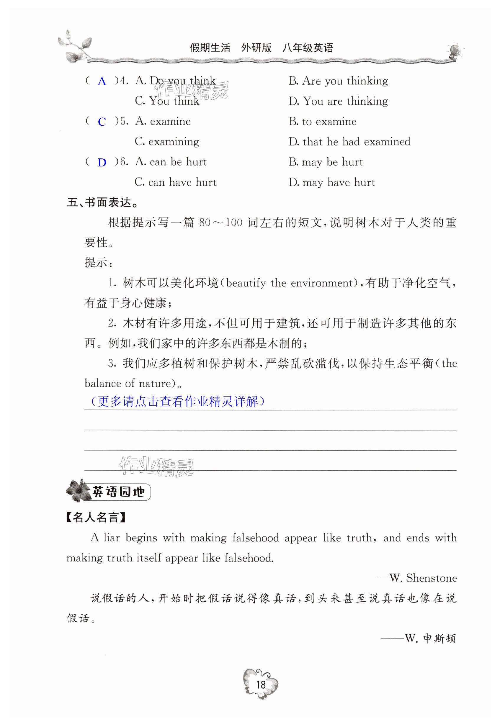 注:目前有些书本章节名称可能整理的还不是很完善,但都是按照顺序排列的,请同学们按照顺序仔细查找。练习册 2025年新课堂假期生活八年级英语外研版北京教育出版社 答案主要是用来给同学们做完题方便对答案用的,请勿直接抄袭。