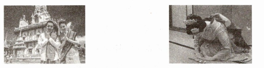【解析】:本题主要考查对不同国家特色礼仪的认知。解题关键在于通过观察图片中人物的动作、服饰等细节,结合所学知识来判断对应的国家。对于第一幅图,需关注人物合十的手势以及所处的建筑环境;对于第二幅图,要留意人物跪地磕头的动作和服饰特点。