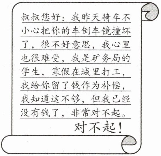 2017年2月5日凌晨3点,高二学生陈奕帆骑电动车在送外卖的路上不小心撞上停在路边的宝马车,导致宝马车倒车镜损坏,车身多处划伤。肇事后,他没有选择逃跑,而是写了一封道歉信,并用它包着身上全部的311元现金,粘在宝马车左前门的把手内侧。第二天,车主薛战民发现了道歉信和钱,被家境并不太好的陈奕帆的行为所感动,选择了谅解,除将311元钱还给对方外,决定拿出一万元钱资助他的学业,以此来鼓励更多的人像陈奕帆这样去做。