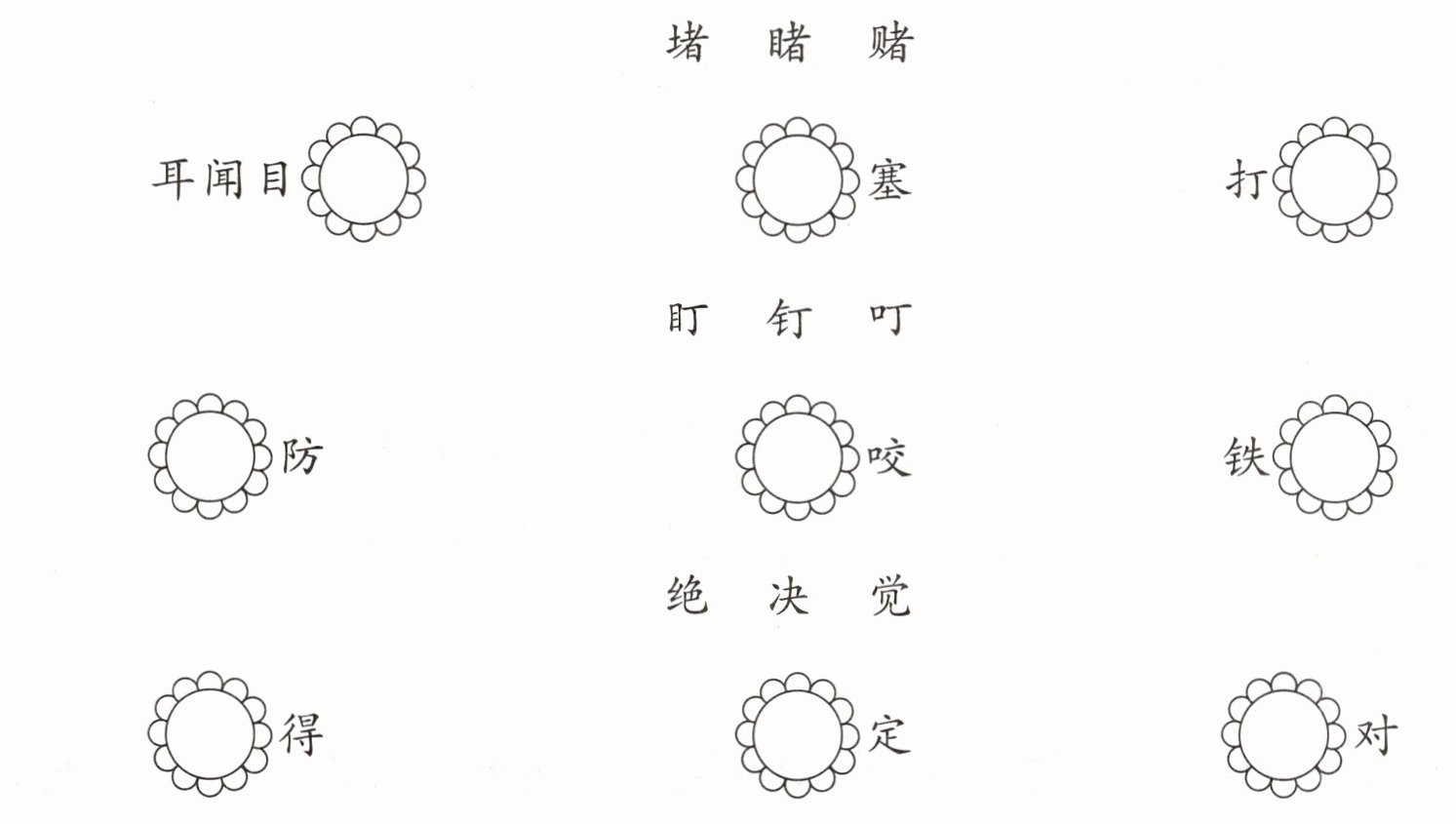 睹、堵、赌;盯、叮、钉;觉、决、绝。