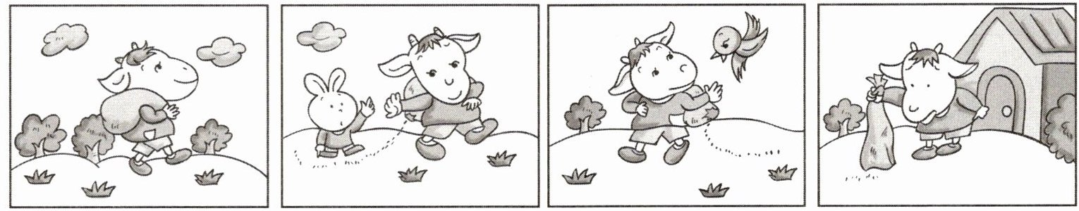 四、今天是星期天,小山羊背着一袋米,高兴地走在回家的路上,小兔和小鸟看见小山羊的米袋漏了,赶快跑上前去告诉它。猫先生听到了它们之间的对话,你能帮它写下来吗?