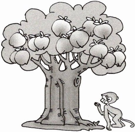 长臂猴栽了一棵桃树,居然结了不少桃子。大小猴子们尝了鲜桃之后,都照它的样子栽起了桃树。