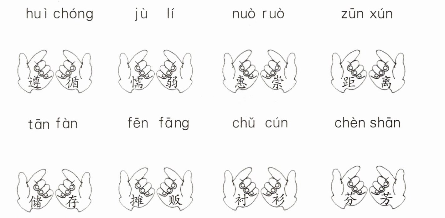 huì chóng—惠崇 jù lí—距离 nuò ruò—懦弱 zūn xún—遵循 tān fàn—摊贩 fēn fāng—芬芳 chǔ cún—储存 chèn shān—衬衫