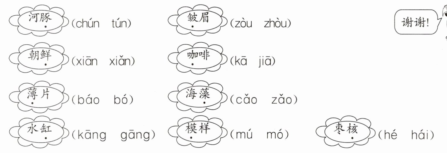 小鹦鹉想读一读花儿上的词语,可怎么也读不准,它很着急。你能帮它画出正确读音吗?
