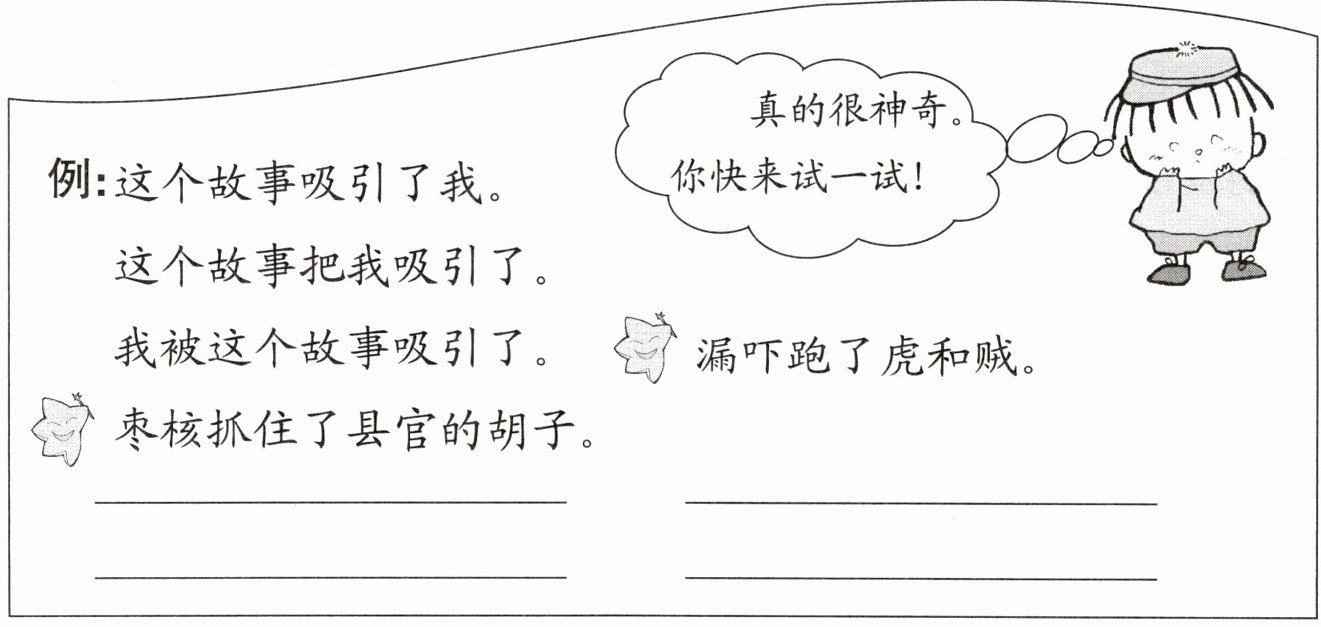 枣核把县官的胡子抓住了。县官的胡子被枣核抓住了。漏把虎和贼吓跑了。虎和贼被漏吓跑了。