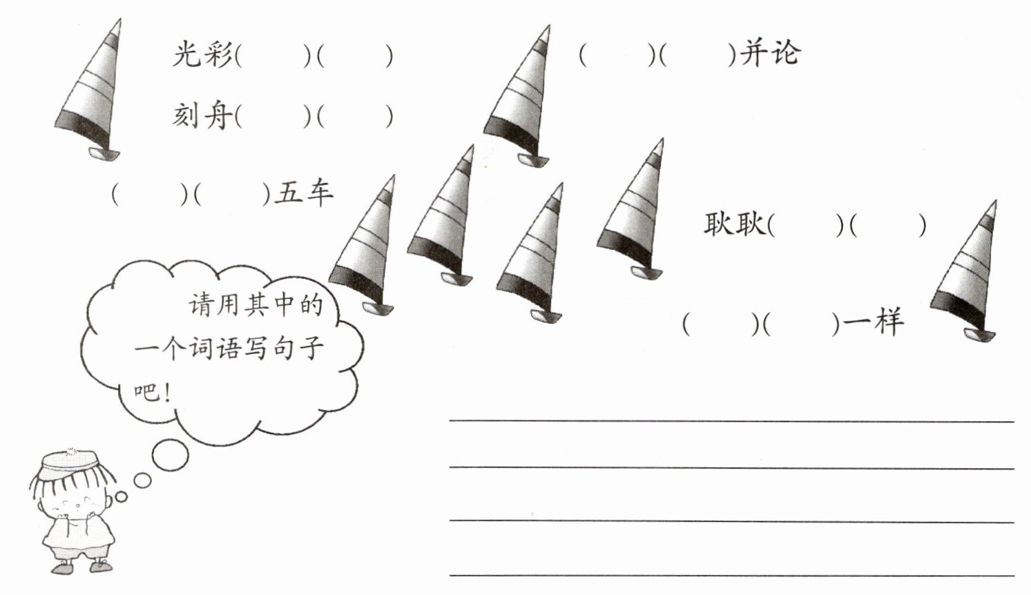 看帆船:光彩(夺目) (相提)并论 刻舟(求剑) (学富)五车 耿耿(于怀)