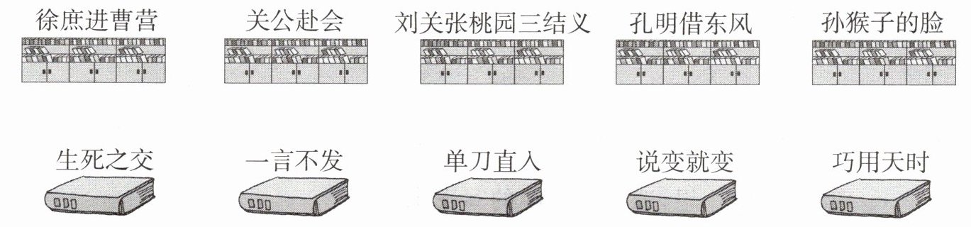刘关张桃园三结义——生死之交 徐庶进曹营——一言不发 关公赴会——单刀直入 孙猴子的脸——说变就变 孔明借东风——巧用天时