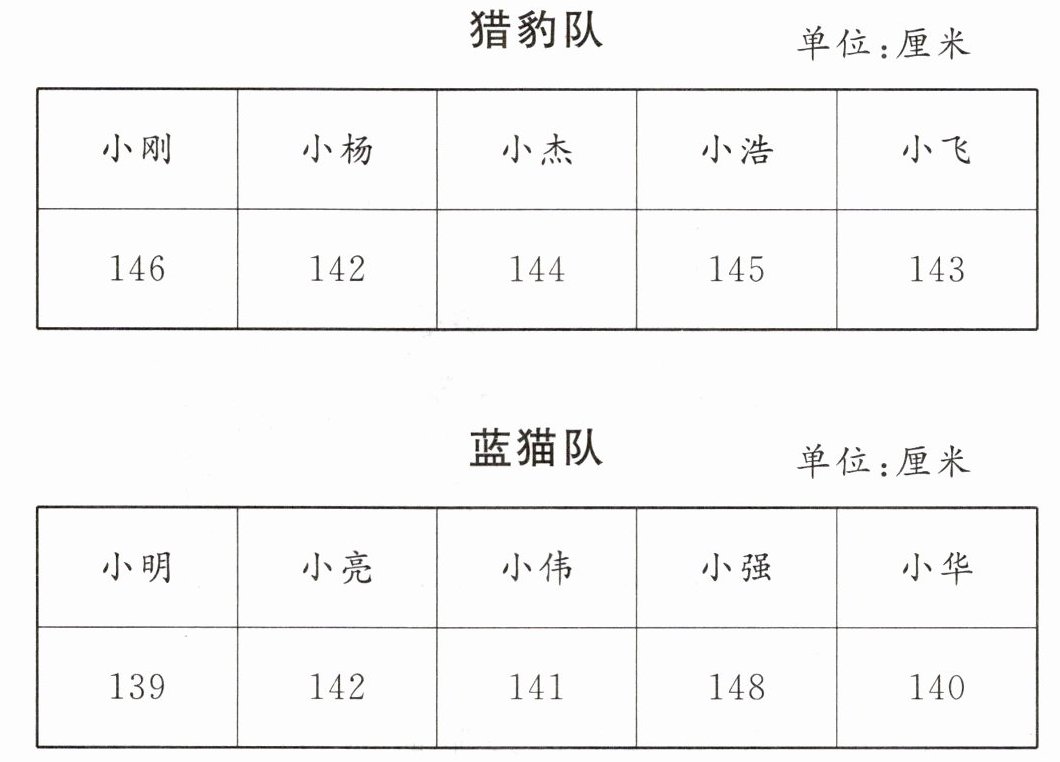 答案: 猎豹队队员的平均身高是144厘米,蓝猫队队员的平均身高是142厘米。