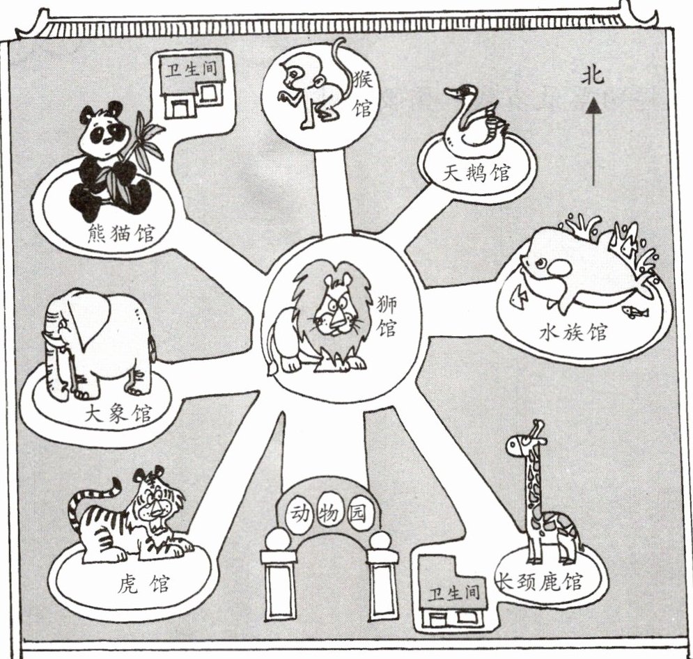 (1)猴馆在狮馆的( )面,狮馆在( )的西南面。