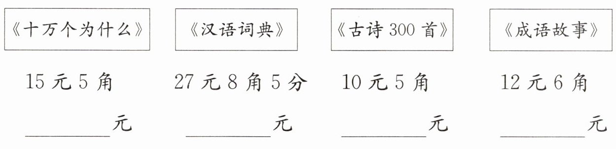 书架上有许多书,你能把下面图书的标价写成以“元”为单位的小数吗?