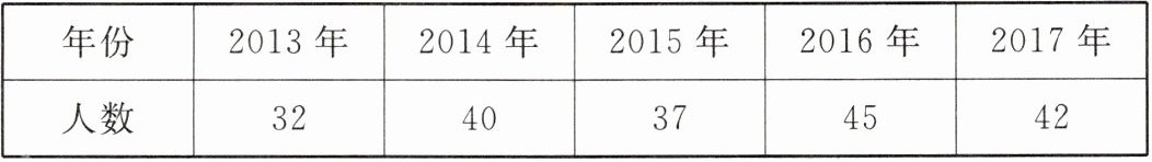 答案:图略(在统计图中,横坐标表示年份,从左到右依次为2013年、2014年、2015年、2016年、2017年;纵坐标表示人数,刻度从0开始,根据数据范围可适当确定刻度间隔,比如间隔为5。然后在对应的年份位置上,根据人数描点,如2013年在纵坐标32的位置描点,2014年在纵坐标40的位置描点,2015年在纵坐标37的位置描点,2016年在纵坐标45的位置描点,2017年在纵坐标42的位置描点,最后将这些点用线段依次连接起来,形成折线统计图)。
