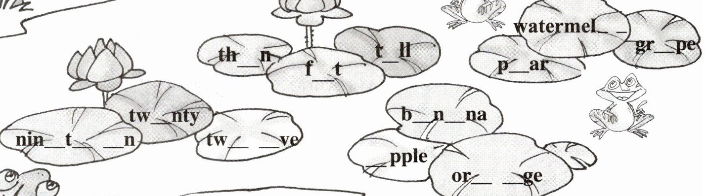 Ⅱ.小青蛙在河里嬉戏,把荷叶上的一些字母弄掉了,小朋友,你能帮它重新补上吗?(补全单词)