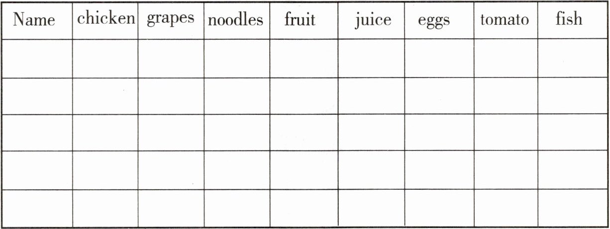 | Name | chicken | grapes | noodles | fruit | juice | eggs | tomato | fish |