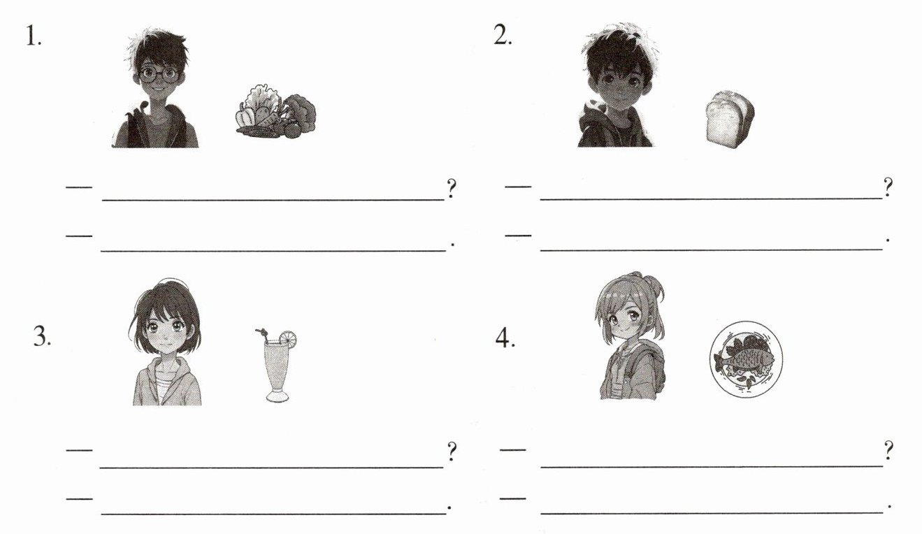 【解析】:本题主要考查一般疑问句的提问与回答,涉及对不同食物的喜好询问。需要根据图片所展示的食物,运用所学的英语句型进行问答。一般对于“Would you like...?”的回答是“Yes, please.”或“No, thanks.”;对于“Do you like...?”的回答是“Yes, I do.”或“No, I don't.”,并可以补充自己喜欢的东西。