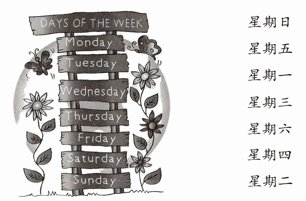 这是一道英语三年级的中英文连线题。考查学生对一周七天英文表达和对应中文表达的掌握情况。解题方法是将英文单词“Monday”“Tuesday”“Wednesday”“Thursday”“Friday”“Saturday”“Sunday”与对应的中文“星期一”“星期二”“星期三”“星期四”“星期五”“星期六”“星期日”进行连线。