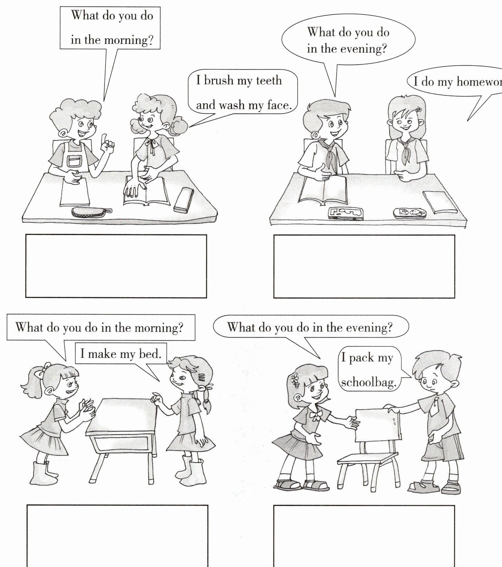 图略(第一组图:左边早上场景画一个人在刷牙洗脸;右边晚上场景画一个人在做作业。第二组图:左边早上场景画一个人在整理床铺;右边晚上场景画一个人在收拾书包。)
