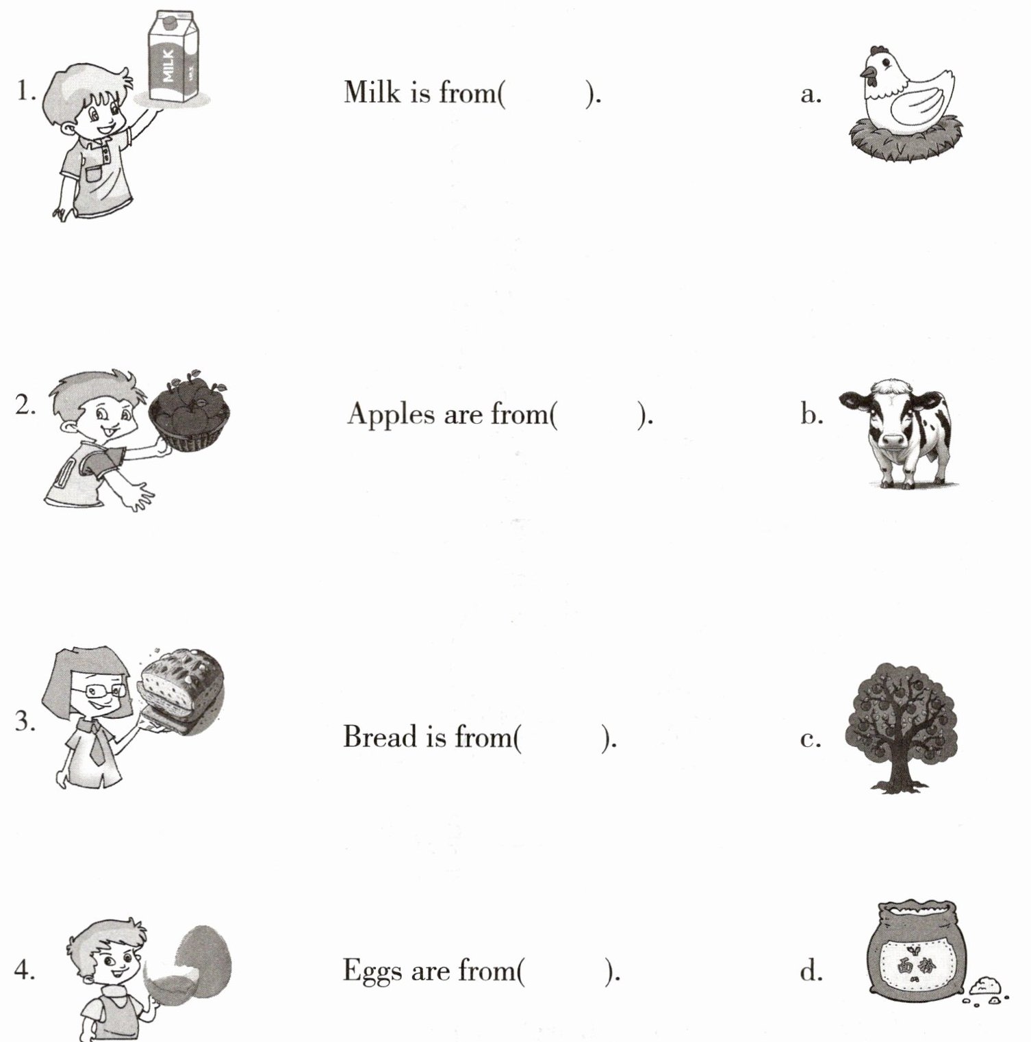 II.你知道这些食物来自哪里吗?将正确答案的序号填入括号内。