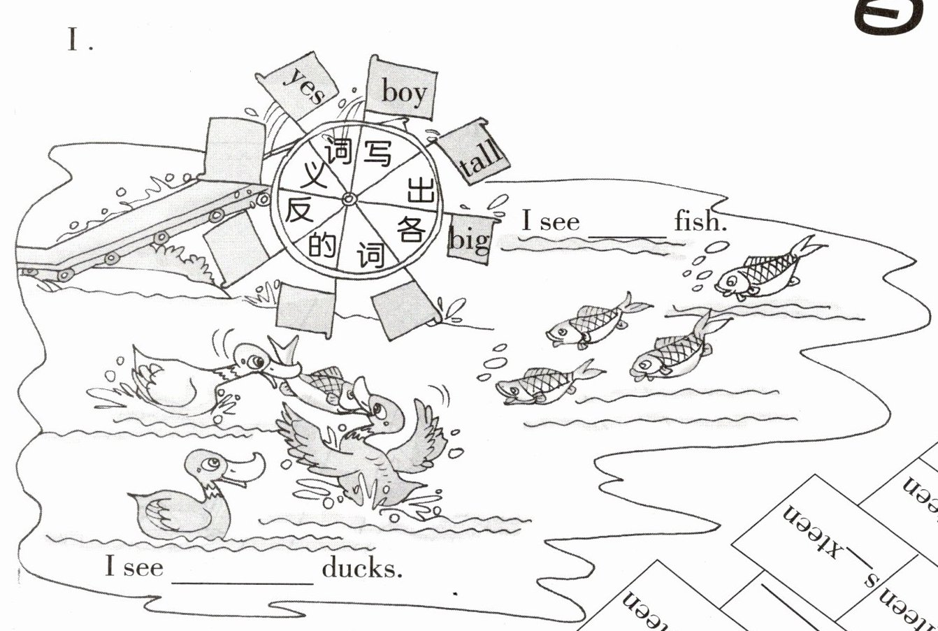yes—no boy—girl tall—short big—small I see five fish. I see three ducks.