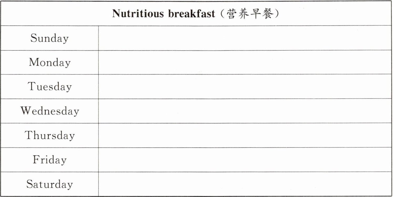 题目考查英语日常交际用语,以及数据统计和早餐营养搭配知识。完成调查表部分,需运用“What would you like for breakfast?”及回答“I would like...”等句型进行交流;统计图和小汇报部分,要对调查结果进行数据统计并以文字形式汇报;设计营养早餐部分,要了解营养知识,合理搭配一周早餐。
