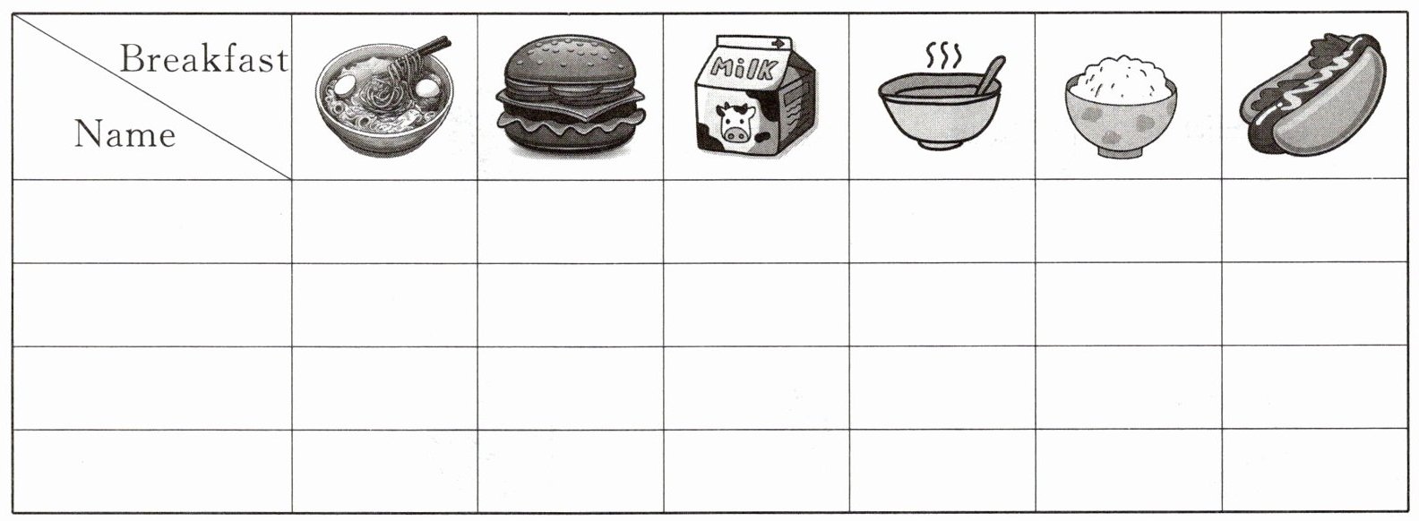 Ⅱ.调查活动。班主任陈老师想要了解班内同学的早餐情况,你能帮助陈老师完成这份调查表,然后绘制统计图并写一个简单的小汇报吗? 针对调查表,你能和同学们一起为班级设计一份“一周爱心营养早餐”吗? 快来试试看吧!