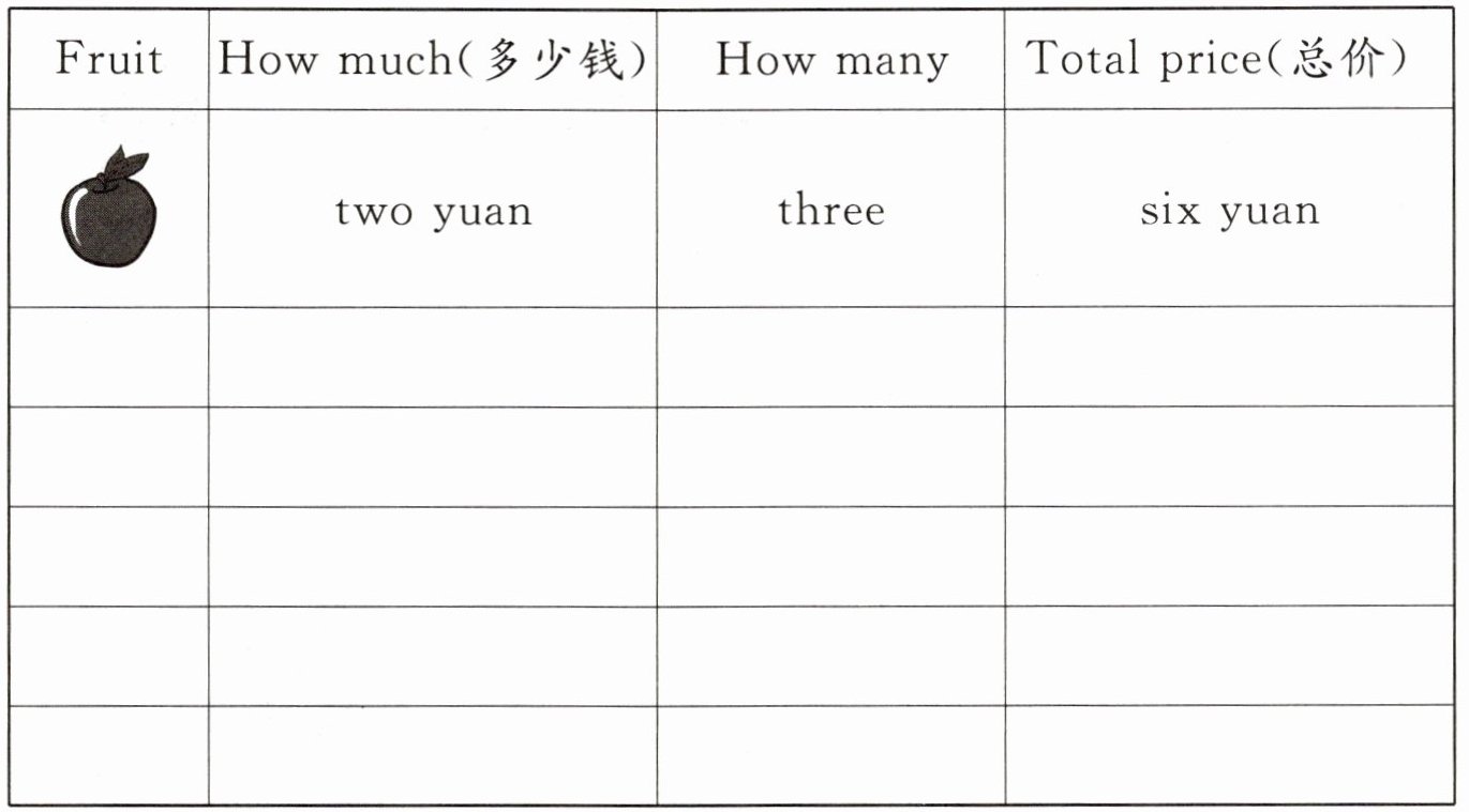 | Fruit | How much(多少钱) | How many | Total price(总价) |
