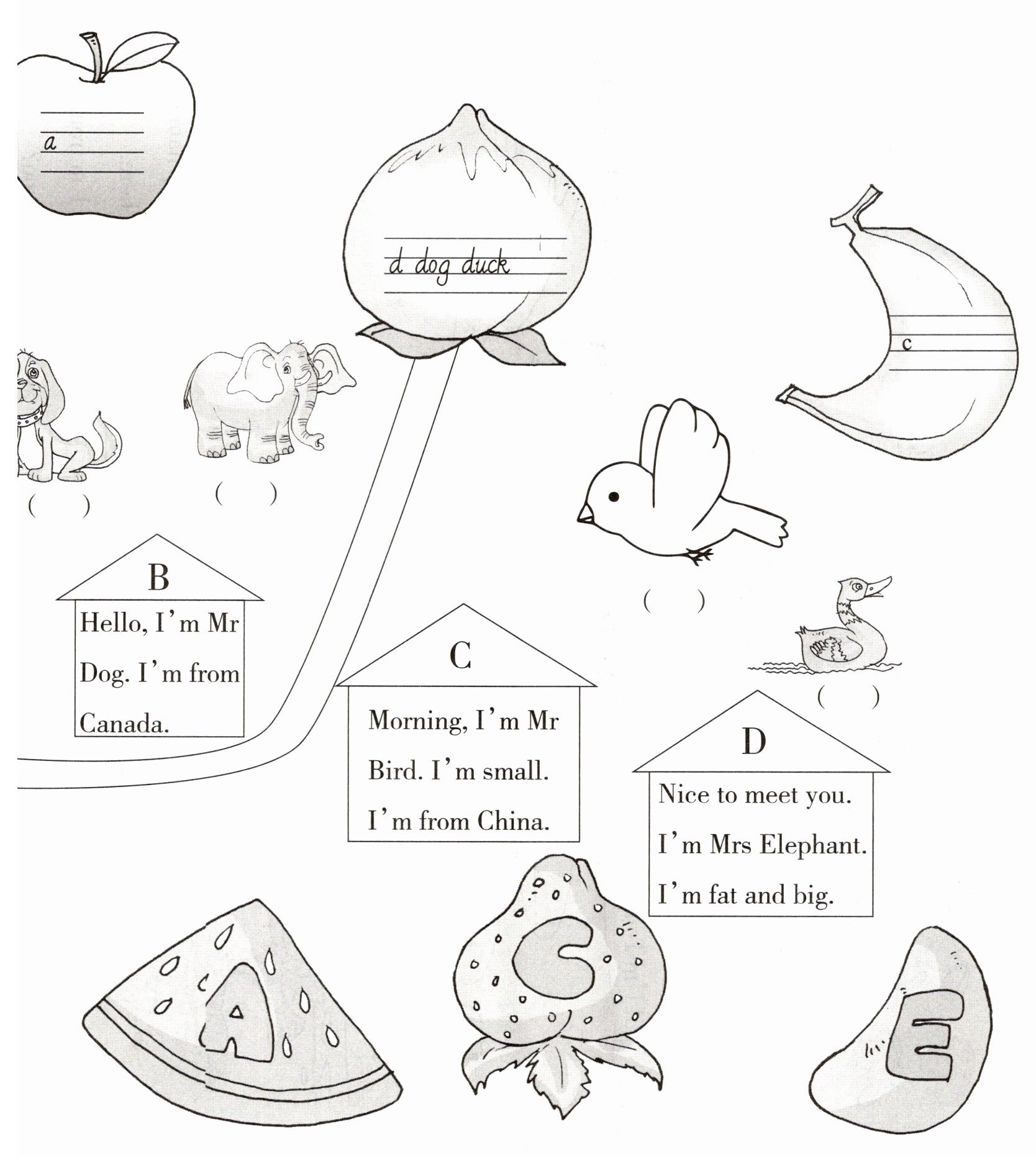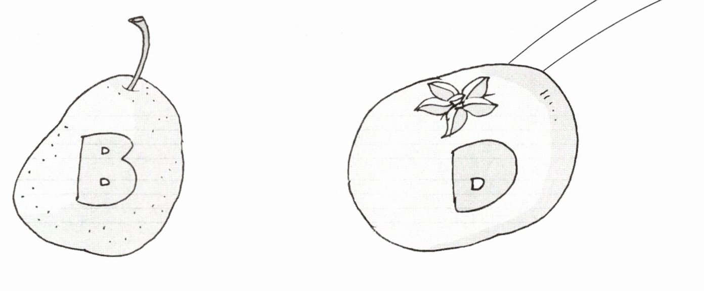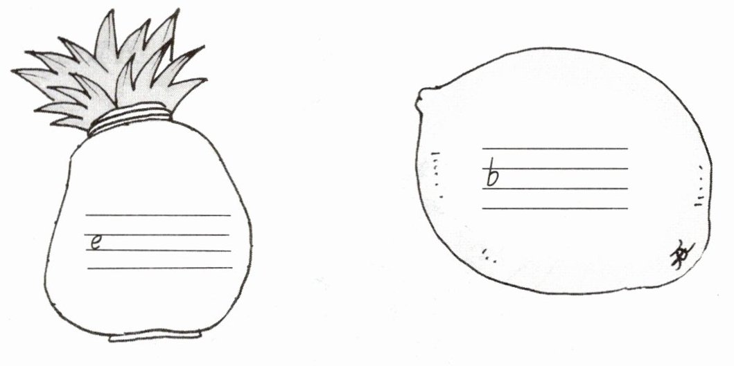 Ⅰ. 帮助水果上的大写字母 A、B、C、D、E 找到各自的好朋友,并写出两个以该字母为首字母的单词。