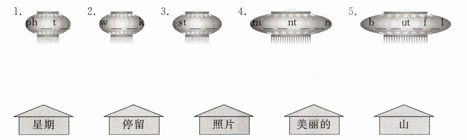 1.photo—照片 2.week—星期 3.stay—停留 4.mountain—山 5.beautiful—美丽的