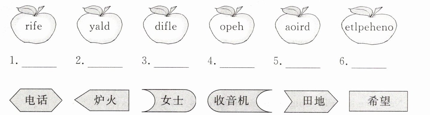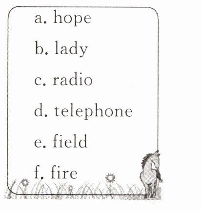 1. fire,炉火 2. lady,女士 3. field,田地 4. hope,希望 5. radio,收音机 6. telephone,电话