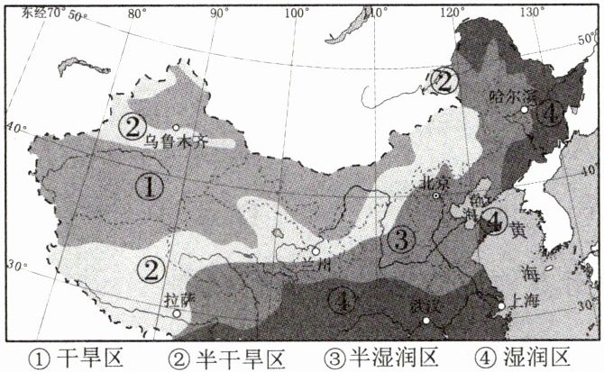 1. 内蒙古自治区从西向东干湿地区的变化依次是干旱区、