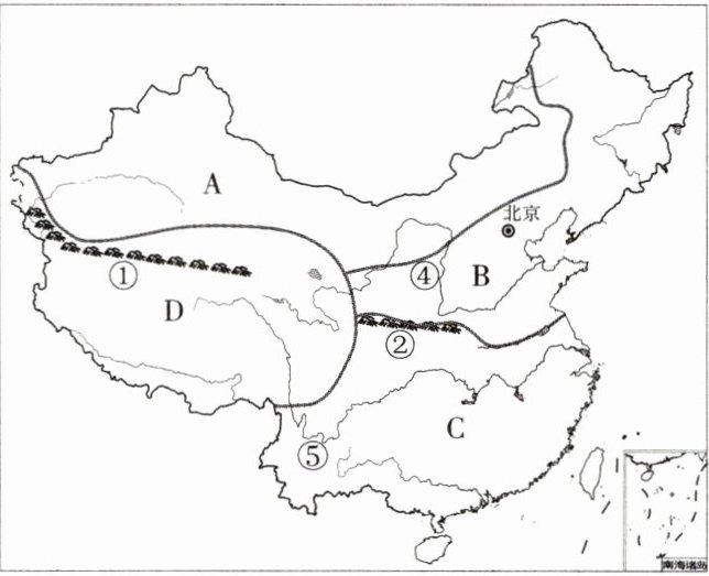 1. A 西北地区 B 北方地区 C 南方地区 D 青藏地区 2. ①昆仑山 ②秦岭 3. 7、8 春 4. ④ ⑤