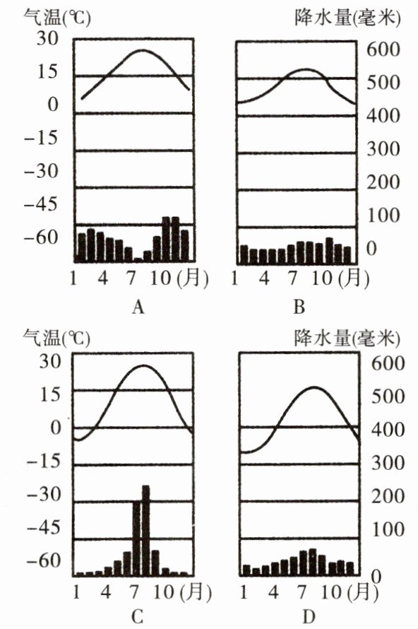 2. 下列四幅图中,反映北方地区气候特征的是(