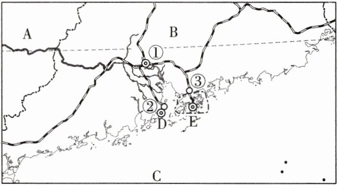 。3. 城市①②③所在的珠江三角洲地区,是我国对外开放的前沿地带,请对其地理位置作出简单的评价。