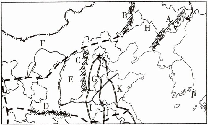 1. A 长白山 B 大兴安岭 C 太行山 D 秦岭 E 黄土高原 F 黄河 G 华北平原 H 东北平原 2. I 京广 J 京九 K 京沪 3. 高温多雨 东北平原 4. 水土流失严重。